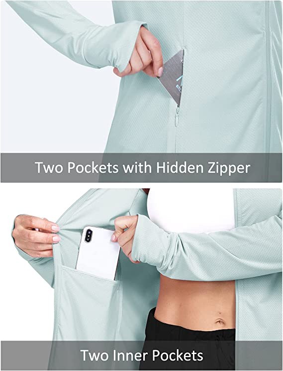 • 2 Side Hidden Zipper Pockets: Women's outdoor sun shirts jackets have 2 side zipper pockets and 2 inner pockets. The pocket is large, half of the space already can hold a 6.7" phone.